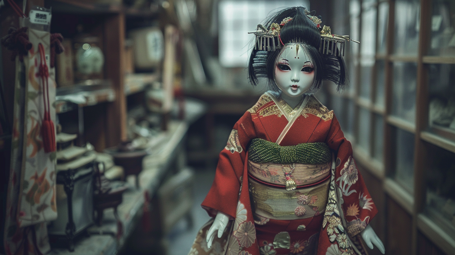 埃まみれの棚に並ぶ無数の品々の中で、ひときわ目を引く存在感を放っていた。全体が深い紅に彩られた和装人形。その顔は異様なまでに精巧で、目がこちらをじっと見つめているように感じられた。店主はそれに気づいたのか、静かに近寄ってきた。